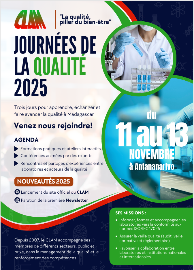 L’objectif du CLAM est de promouvoir et de soutenir la mise en place de la démarche qualité dans les laboratoires. En effet, la qualité n’est pas un choix, ni un luxe, mais une nécessité pour soutenir le développement du pays. Afin d’assurer son rôle, le CLAM organisent périodiquement des formations et des conférences sur les thématiques de laboratoires. Des pools d’experts seront créer afin de satisfaire les besoins croissants en coaching et en formation. Le consortium appuie également toutes les initiatives visant à renforcer les infrastructures qualité à Madagascar.